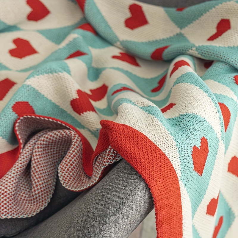 French Style Geometric Heart Pattern Blanket - Turquoise & Red All-Season Soft Acrylic Throw, 280gsm Cozy Lightweight for Living Room, Bedroom, Office - Machine Washable Christmas, Valentine's, New Year Gift with Background & Multicolor Hearts -
